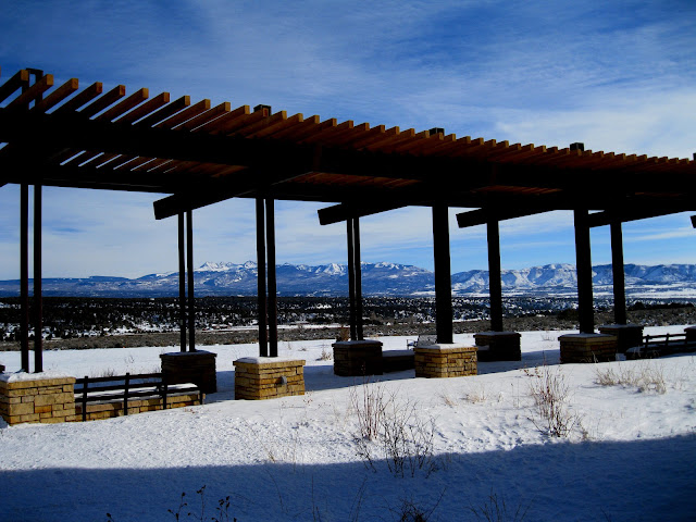 On the north side of the new Visitor Center there are large ramada shaded areas and benches with good views toward Mt. Hesperus and the LaPlata Mountains. My visit was in late December about 9 days after the opening. Despite the winter conditions there was a steady flow of visitors.